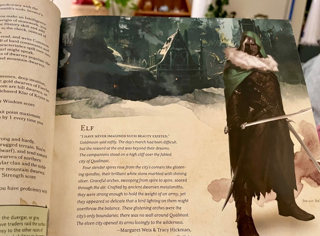 As we flip through M’s handbook, we look at illustrations of half-orcs with boar-like tusks peeking out of the corners of their mouths, of elves with their willowy, elegant bodies and long pointed ears, of halflings with their compact little bodies and brightly coloured outfits. The pages are rich with lore, abilities, and personality traits, and the urge to read the entire handbook, all 300 pages of it, right then and there strikes me. It’s a whole new world to learn about.