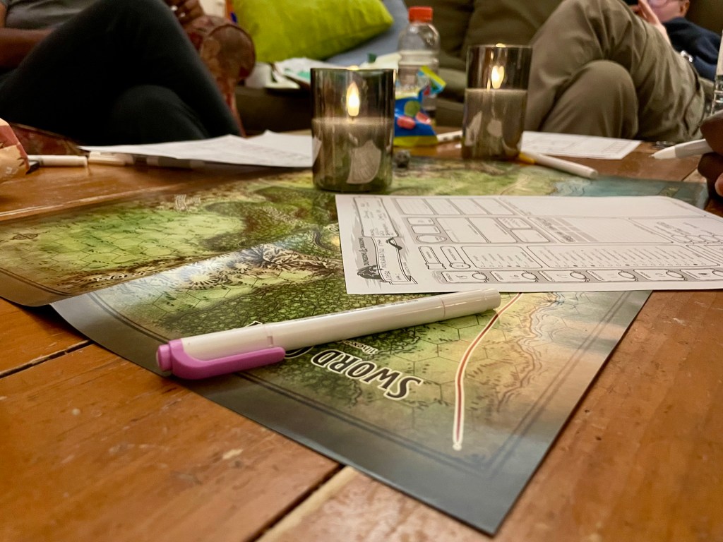 In front of us, a fictional map of a place called the ‘Sword Coast’ lays flat on the coffee table, quadrants still creased from being folded. Empty character sheets, cracked open guide books, scrap paper, pens and highlighters, dice, and even faux flickering candles clutter the outskirts of this unexplored realm.